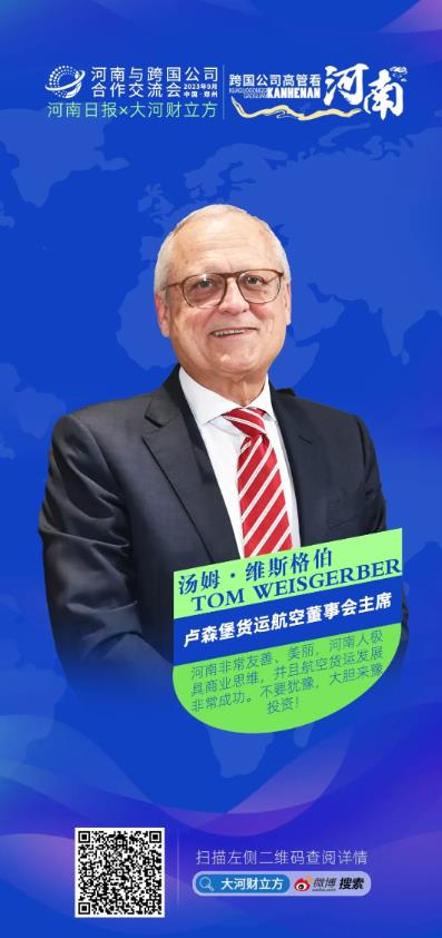 9月5日,盧森堡貨航董事會(huì)主席湯姆·維斯格伯前來(lái)鄭州參加河南和跨國(guó)公司交流合作會(huì),同行的還有盧森堡貨航總裁兼首席執(zhí)行官理查德·福森,兩位負(fù)責(zé)人聯(lián)袂遠(yuǎn)道而來(lái),足見他們對(duì)河南的重視。