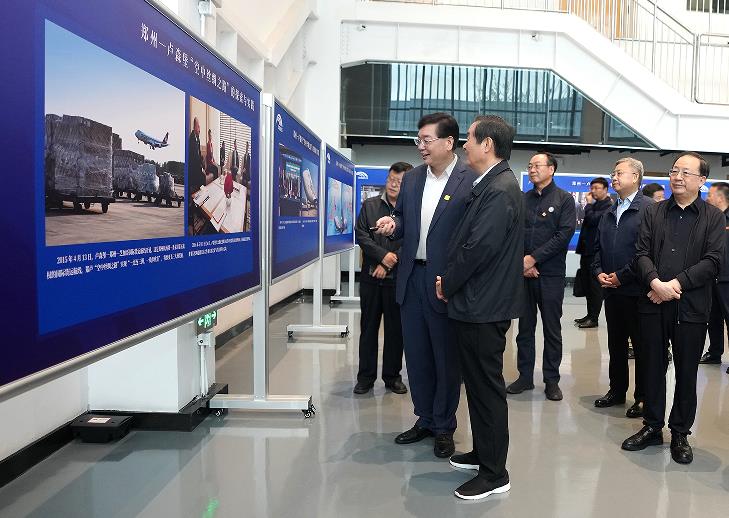 在位于鄭州航空港區(qū)的航投培訓(xùn)中心,劉奇葆首先參觀了“鄭盧‘空中絲綢之路’的探索與實(shí)踐”圖片展。張明超詳細(xì)介紹了35張圖片背后的故事和內(nèi)涵,匯報(bào)了“一帶一路”框架下鄭盧“空中絲路”的建設(shè)歷程和發(fā)展現(xiàn)狀。