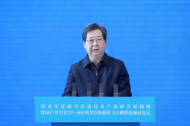 樓陽(yáng)生為河南先進(jìn)航空仿真技術(shù)產(chǎn)業(yè)研究院揭牌。中國(guó)工程院院士趙沁平受聘擔(dān)任研究院專家技術(shù)委員會(huì)主任。民航河南監(jiān)管局向河南航投集團(tuán)頒發(fā)B737-800機(jī)型模擬機(jī)D級(jí)合格證。