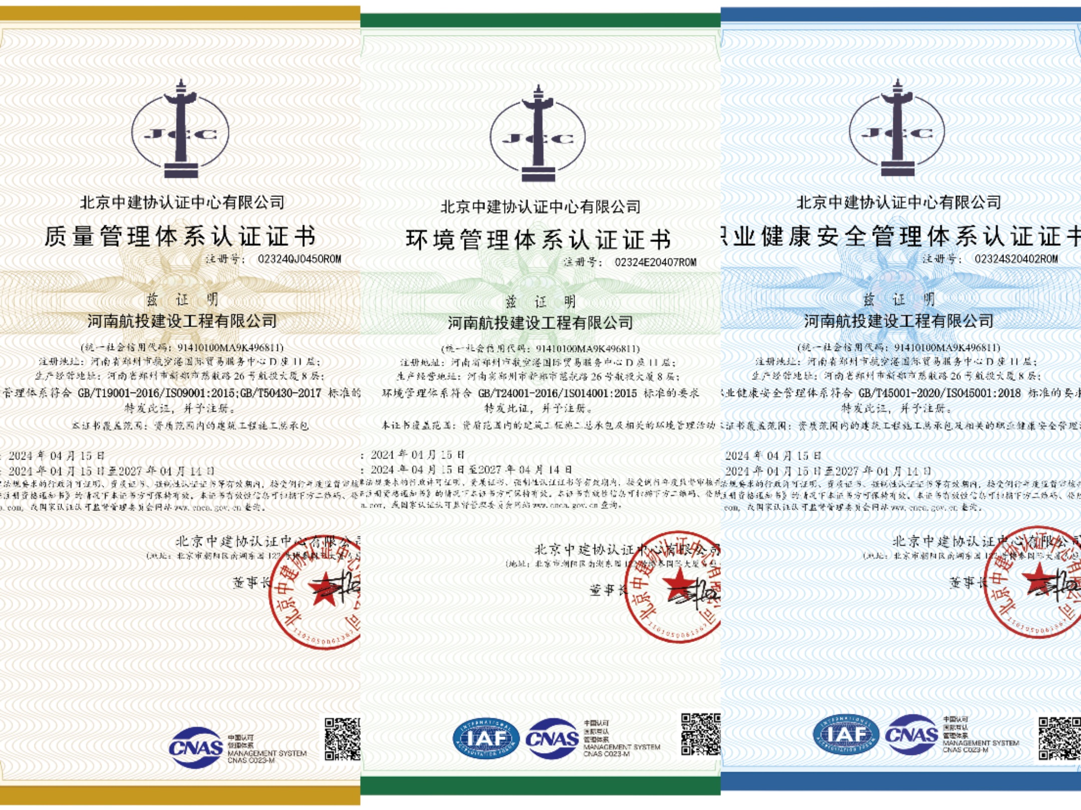 4月15日,河南航投建設(shè)工程有限公司(以下簡(jiǎn)稱(chēng)航投建工)通過(guò)ISO9001質(zhì)量管理體系、ISO14001環(huán)境管理體系、ISO45001職業(yè)健康安全管理體系(以下簡(jiǎn)稱(chēng)ISO三體系)認(rèn)證并獲得證書(shū),這標(biāo)志著航投建工的規(guī)范化標(biāo)準(zhǔn)化管理邁上新臺(tái)階,為持續(xù)提升市場(chǎng)競(jìng)爭(zhēng)力、拓展合作新領(lǐng)域打下堅(jiān)實(shí)基礎(chǔ)。
