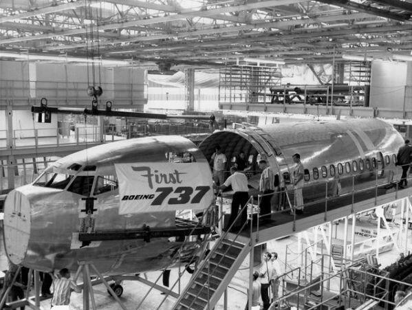 圖:1966年7月,首架737進行機頭和機身的組裝。圖片來自《西雅圖時報》