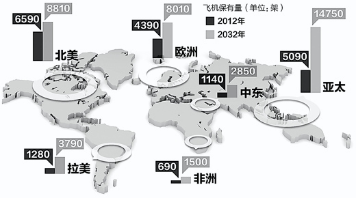 根據(jù)波音公司的預(yù)測(cè),未來20年全球民機(jī)市場(chǎng)規(guī)模將翻一番,新興市場(chǎng)成為增長(zhǎng)主動(dòng)力。到2032年,全球?qū)⑿略龀^3.5萬架飛機(jī),總額高達(dá)4.8萬億美元。亞太市場(chǎng)增幅最大,將新增1.282萬架飛機(jī),總額1.89萬億美元。其中,中國(guó)市場(chǎng)發(fā)展最為迅速。空客公司總裁兼首席執(zhí)行官密法布里斯·布利葉認(rèn)為,中國(guó)航空業(yè)的迅速發(fā)展是中國(guó)經(jīng)濟(jì)社會(huì)發(fā)展的必然產(chǎn)物,中國(guó)航空業(yè)發(fā)展的年均增速約為10%,同期全球航空業(yè)的增速則為5%。在未來20年,中國(guó)將成為世界最大的航空市場(chǎng)。