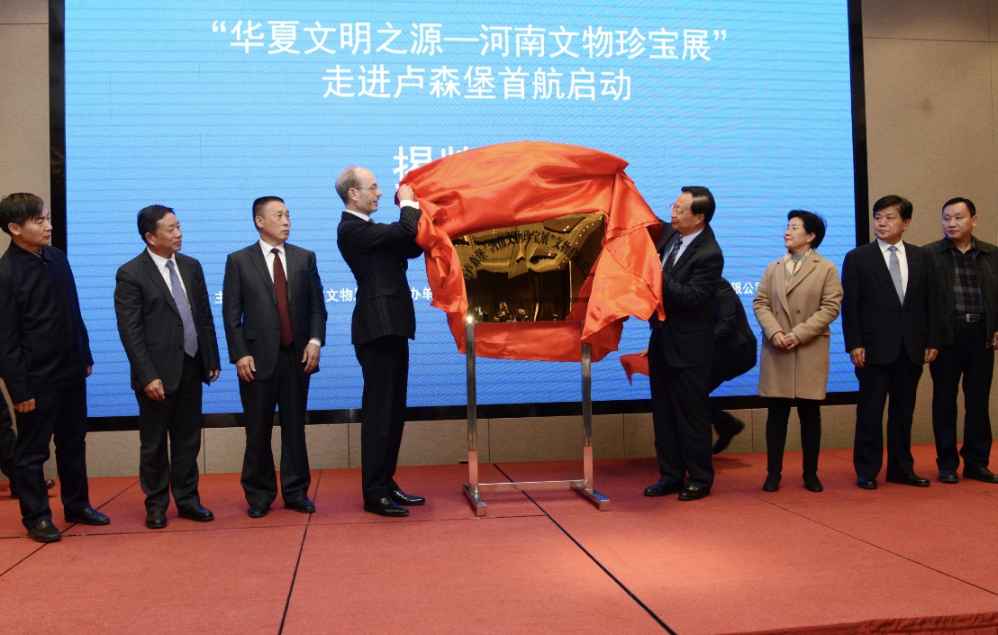 河南省政協(xié)副主席高體健,盧森堡駐華大使俞博生,河南省文物局局長田凱及河南航投總經(jīng)理、黨委副書記、副董事長劉建葆,副總經(jīng)理郭艷紅等出席儀式。高體健、俞博生、劉建葆分別致辭。高體健和俞博生共同為啟動儀式揭牌。